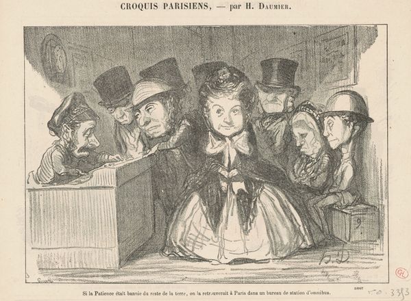 Curator: Honoré Daumier’s lithograph, dating from the 19th century, is titled “Sur l’Imperiale." It depicts passengers crowded atop what appears to be a horse-drawn carriage in a cityscape. Editor: My first impression is one of satirical observation. There's a raw energy in the quick, confident lines. The exaggeration of the figures gives the piece an immediate sense of dark humor, or even disdain. Curator: Absolutely. Daumier used caricature to critique French society during a time of rapid social change. Consider the term “imperiale" itself—a reference to the upper level of a public transport vehicle but also loaded with connotations of empire and control. Do you think the image plays on that double meaning? Editor: I do. The way the figures are stacked and crammed together reinforces the oppressive feeling. It's claustrophobic. Notice how Daumier uses contrasting lines—heavy in the foreground, lighter in the background—to flatten the space and compress the figures even more? Curator: Yes, the figures in the foreground loom out, as if peering over the masses, observing. It reminds me of illustrations that explore power structures within urban environments, highlighting the disconnect between different social strata. Perhaps an intentional critique of capitalist exploitation as the industrial revolution ramped up? Editor: Possibly, though I see the sketch as revealing his artistic intentions through structuralist means. The positioning and attitudes, combined with the textural differences he’s included through lithography. See how the solidity of the roof of the carriage contrasts against the feathery lines of the people above. The figures, despite their individuality, almost blend, their unique characteristics swallowed up. The artist achieves a stark sense of rhythm through these deliberate artistic methods. Curator: So, to you it's about formal elements contributing to the overwhelming sense of conformity, erasing individuality. I wonder, can it also symbolize a struggle for individuality, with each figure clinging to a sense of self? The grotesque features hinting at internal conflict within a society in flux? Editor: I agree that struggle is clearly evident in this visual shorthand; a product of a singular aesthetic impulse. Curator: I am struck again by how he used everyday scenes as vehicles for deeper commentary on political shifts. Editor: Indeed, and the sketch perfectly portrays how meaning can be formed through basic, fundamental design qualities.