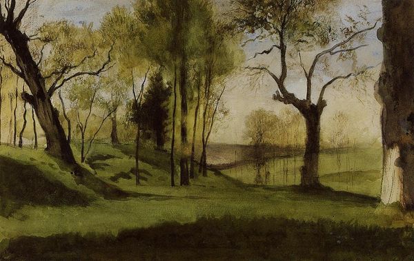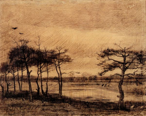 Curator: This is Van Gogh's "The Landscape in Drenthe," an oil painting created in 1883. It's a somewhat atypical work, particularly when considering his later, more vibrant palette. Editor: Yes, and initially, I find the painting remarkably somber, even melancholic. The limited color range contributes heavily to this feeling. There is a real weight to the application of the pigment as well, lending the painting a palpable texture. Curator: The heavy impasto is characteristic, even at this relatively early stage in his career. Consider how the thickly applied paint defines the forms of the trees and landscape; there's a real emphasis on materiality. His brushstrokes contribute a distinctive emotional effect. Editor: Exactly, I'm compelled to think about his state of mind while viewing this piece. Drenthe, after all, was a very isolated, sparsely populated region of the Netherlands at that time, characterized by peat bogs and heathland. The painting reflects that. The landscape appears almost oppressive, and this relates to a cultural understanding of land use in the Netherlands and also rural living at that time. Curator: We can see that play out compositionally as well. The strong horizontals and verticals, created by the landscape and trees, give a very grounded sense, of tangible reality. Yet the application of the oil-paint with rough strokes in order to show the texture of land is interesting to compare to romanticist traditions. Editor: Absolutely. I would suggest that its realism contrasts sharply with many landscape paintings from that era. One would do well to remember that Drenthe in the 1880's faced great poverty; people depended heavily on peat extraction to subsist. This likely impacted the imagery. Curator: The formal rigor mirrors Van Gogh's meticulous, almost scientific approach to representing nature, even early on. It reflects a determined, if perhaps, bleak aesthetic sensibility in my interpretation. Editor: Well, that bleakness serves as a powerful commentary, I think, on the social and economic conditions of the time. His artistic practice makes one question issues around labor, the relation between social context, imagery, and the creative production, so he acts as more than a landscape artist, if one interprets it with his other artworks from this period in mind. Curator: Perhaps it's too simple to focus on color choices, but its somber quality does provide this picture a certain weight that causes you to consider it on more than one level. Editor: I'll definitely need to consider Van Gogh's period in Drenthe with more depth from now on!