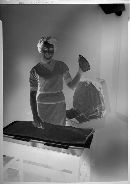 This photograph by Robert Burian captures a woman demonstrating an iron. It's a gelatin silver print, a process that was well-established by the time this image was made. What is interesting here, is that the iron and the clothes are not treated as neutral objects. Consider the social context that surrounds this picture. The image presents a narrative about women and labor, suggesting that women's work in the domestic sphere is to be proudly displayed. The making of clothing, its maintenance, and its presentation involves extensive processes, from the cultivation of raw materials like cotton, to the spinning and weaving, the cutting and sewing, and finally the pressing and folding. Each of these steps relies upon an industrial mode of production, and each bears the mark of human labor, especially that of women. When we focus on materials, making, and context, we can see how this photograph speaks to wider issues of class, labor, and consumption, challenging the traditional separation between fine art and craft.