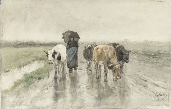 Curator: Jacob Maris painted "Schelpenvisser op het strand," or "Shell Fisherman on the Beach," sometime between 1847 and 1899. This watercolor piece now resides here at the Rijksmuseum. Editor: It has such a melancholy, somber feel to it. The colors are muted, the forms simplified—it almost looks like a faded memory. The figures feel very heavy like their colors will dissolve into the canvas. Curator: Indeed. Maris's handling of watercolor creates a study of atmosphere, achieved by blending washes that construct the elemental scene of the beach and horizon. What do you make of his structural choices in representing the mundane labor? Editor: Well, the fisherman in the water clearly dominates the left, countered by a cart, likely holding all his findings and being pulled by a solemn-looking horse. He also has fishing birds floating by, while on the horizon it appears there is a modest fishing boat. He is really in the middle of his life, and his lifestyle in the painting. The man feels representative of a certain kind of weary perseverance. Perhaps, a symbolic resilience against a harsh environment. Curator: It's noteworthy how Maris employs a restricted palette, mostly gray, blue, and brown. The forms almost appear out of focus and amorphous. Consider how this reinforces an air of solitude, in his depiction of a transient moment in everyday life, and the fisherman's back turned to the viewer, as though intentionally keeping him from view, and any other outside intervention. Editor: True. It does seem the artist has made a decision about that, and there is nothing incidental about this image. I see also how a certain element is not given—like you do not really see how deep the man is wading into the water, because that distinction is blurred. This creates the sense of immersion. It has this feel of timeless labor. Curator: It’s the way Maris captures that particular, fleeting light that I find impressive—a light both enveloping and revealing form simultaneously. The whole composition is perfectly calibrated. Editor: Yes, this image resonates deeply because of Maris’ attention to detail, not of explicit content, but the symbolic and almost cultural memory carried in it. Curator: I'd agree that this picture shows Maris’ remarkable mastery of light, form, and, quite simply, material engagement. Editor: A piece to carry with you and reflect on later.