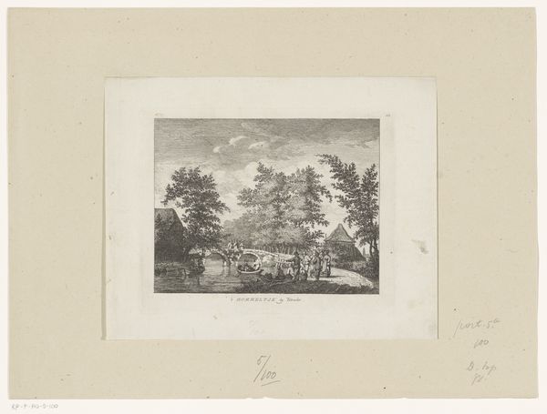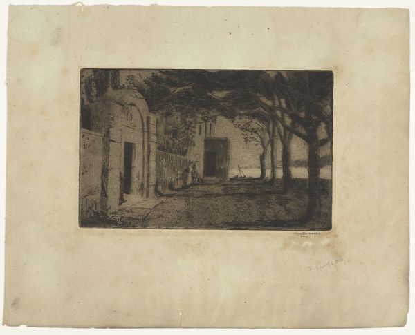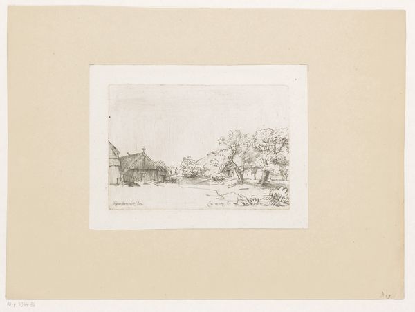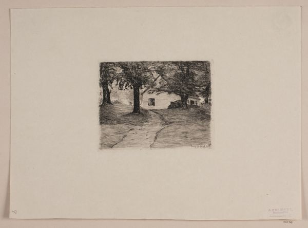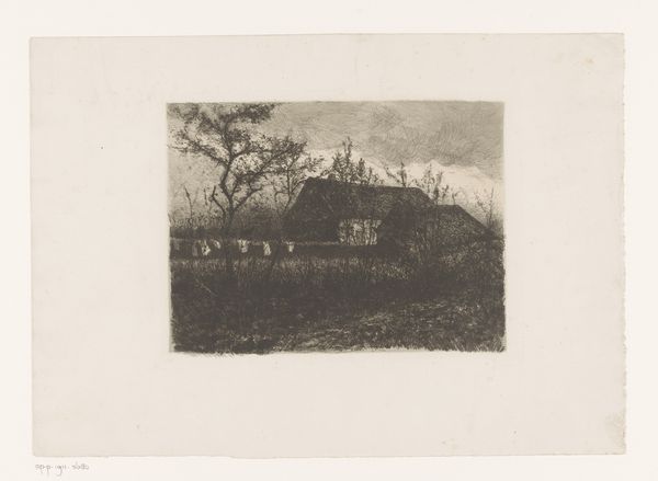 Editor: This is Willem de Zwart’s "Landschap met boerderij," made sometime between 1872 and 1931. It's an etching, so a print. It has this quiet, still quality to it. How do you read this piece? Curator: Consider how de Zwart has articulated space. Notice the deep blacks of the trees contrasted with the hazy grays used for the field. Do you see how the density of line dictates form and depth? The building becomes almost an extension of the landscape itself. Editor: Yes, it’s almost like the farmhouse and trees are all part of the same mass. They blend together, and the varying gray tones almost flatten the scene. Curator: Precisely. The flatness reinforces the picture plane. Now, how does the mark-making itself – the visible etching lines – contribute to your understanding? Editor: I see that the lines follow the forms of the landscape. They’re more horizontal in the field and become more vertical and dense in the trees. This rhythm adds texture and, surprisingly, almost makes it more abstract. Curator: Indeed. By observing the formal qualities – the interplay of line, tone, and composition – we begin to grasp de Zwart’s engagement with realism not as mere replication, but as a constructed visual experience. Editor: So it’s less about accurately depicting a farm and more about the artist's process of seeing and rendering form, light, and shadow. Curator: Precisely. De Zwart prioritized these structural elements in creating this seemingly simple image. Editor: That shifts my perspective a lot! It's interesting how technique shapes our perception. Curator: And how visual analysis can bring so much more depth to even a modest image.