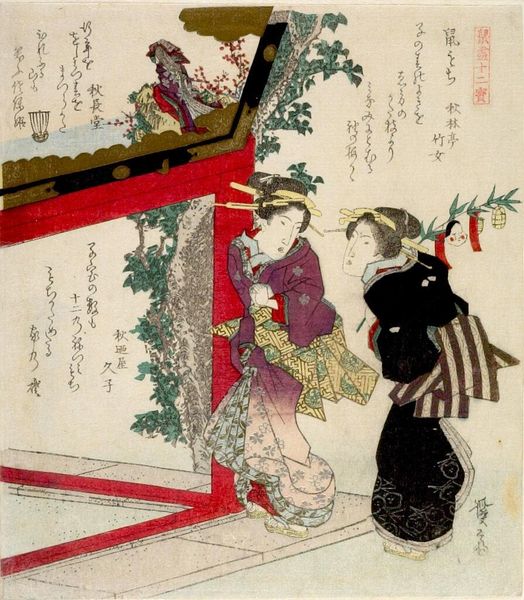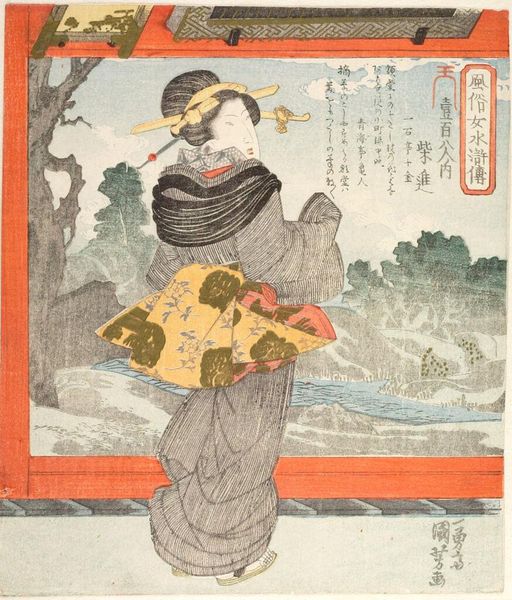 Editor: This is Yashima Gakutei's "Kibi no Anihime," from his series on filial piety. She seems so isolated, standing on that elaborate, almost precarious-looking structure. What strikes you most about this piece? Curator: Ah, yes. The isolation, you say? Perhaps it's a reflection of the weight of familial expectation, almost a theatrical stage for her devotion. The poem adds another layer, doesn't it? I wonder, what sacrifices are implied in her stance? Editor: I see what you mean. I guess I was focused on the visual isolation and missed the weight of the story. Thanks! Curator: Absolutely! Art’s like life, layers upon layers; isn't that the joy of digging deeper?