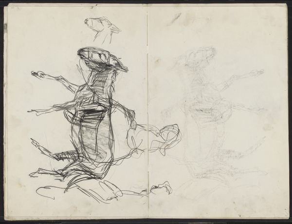 Curator: Breitner’s “Woman with Hat, Seen From the Back,” made between 1893 and 1898, immediately strikes me with its provisional quality. The rapid graphite lines on paper offer us only the barest essence of the sitter. Editor: Yes, there’s a ghostly quality to it, like a fleeting memory or an impression caught mid-thought. Notice the contrasting approaches he used to define the shape on the left side of the sketchbook spread, rendering it dark, dense, and more descriptive; on the other side it is looser. It speaks volumes about the artistic process, that push and pull between intention and spontaneous creation. Curator: And in looking at the social context, we understand this as characteristic of Breitner. His artistic exploration always investigated the tensions between representation and social reality, particularly for women. Here, her identity is shielded from us, rendering her almost an object of study. But the hat also denotes status, doesn’t it? It signals a bourgeois identity and her place within a rigid class structure. Editor: Certainly. The hat, presented in the tradition of fashionable bourgeois identity markers, carries specific weight. Historically, hats have functioned as symbols of social standing, gender roles, and even personal expression, which adds depth to our reading of the image. Curator: Considering its impressionistic style, what are your thoughts on the artist choice to leave one drawing more refined, than the other? Does that hold a mirror to society? Does it have to do with gender expression? Is it a simple style? Editor: Interesting! Those visual signifiers might represent an idea or concept, it seems he is experimenting with the psychological implications of visibility and concealment, playing with how identity is constructed and perceived through both individual choices, as well as societal constraints. Curator: Considering our society today and where we’ve come regarding class and gender norms, one has to reflect on how far we’ve come as humans; this work gives us space to have such necessary discussion. Editor: Precisely. It acts as a visual bridge connecting the cultural landscape of the late 19th century with present-day dialogues about identity.