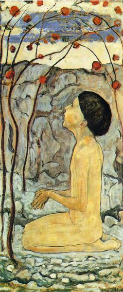 Ferdinand Hodler painted *The Dream* using oil on canvas. This composition is dominated by its verticality, reinforced by the almost regimented field of green. A seated woman draped in white is central, her fiery red hair contrasting with the cool tones around her. Her gaze is downward, drawing our eye to the unsettling panel below. Hodler uses symbolism to explore themes of mortality, memory, and the unconscious. The woman above, perhaps a representation of consciousness, seems to contemplate the image of a nude body, which could be her own, lying as if deceased. This stark juxtaposition destabilizes notions of life and death. Consider the formal elements at play: the upward reach of the flowers versus the downward slump of the figure. These directional cues create a visual tension, suggesting a world in conflict between life's vitality and the inevitable pull of death. This isn't just a painting; it's a philosophical inquiry into the human condition, rendered through form and symbol.