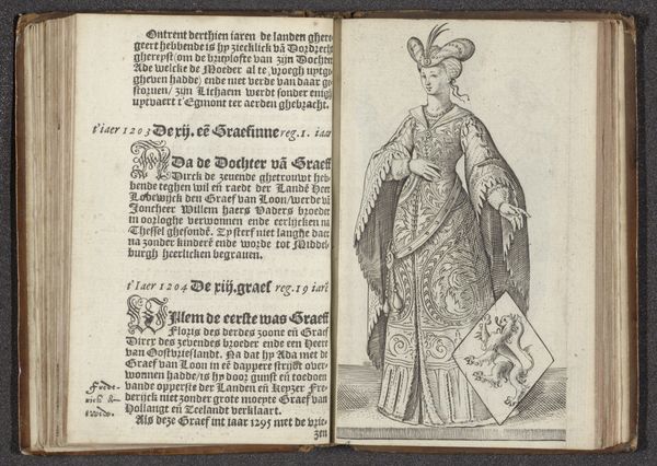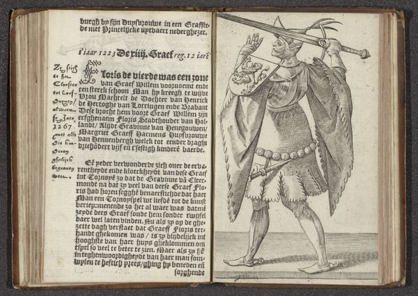 Curator: Here at the Rijksmuseum, we're looking at Hendrick Goltzius’s “Graaf Floris V van Holland,” an engraving from between 1586 and 1587. Editor: My first thought? This guy radiates authority. The sword, the shield emblazoned with a lion, the regal gaze... he's a ruler distilled into ink. Though I can't tell whether I'm more drawn to the clean execution of the printmaking or intimidated by him. Curator: Indeed. Goltzius, though working nearly three centuries later, positions Floris as this idealized, almost mythical figure. The artwork sits within a book, a history book most likely, framing Floris as a page within Dutch history. Editor: That book is intriguing. I'm getting this vibe of layers of history upon history. The text framing the image suggests an integration of historical accounts, like Floris stepped out of the written word itself. That placement lends a weight of factual gravity... though how accurate the account, is anyone's guess. But it has such an amazing symbolic echo! Curator: Precisely! The details really drive home this impression. His armor isn't just protective; it’s ornate, signaling status. He also holds that shield almost casually—it protects his front—his honor. His posture is powerful yet balanced—indicating experience, right? I love the balance! And if the sword were not slung so nonchalantly behind him, it would throw the engraving entirely out of balance, wouldn't it? Editor: Definitely! To me, it evokes the idea of inherited power and legacy. A figure whose life is already enshrined and made into symbols before the story even finishes unfolding. How the emblems become divorced from individual events, becoming...cultural shorthand. It’s the very early marketing or branding of dynasty! Curator: A visual reminder of legacy in those Dutch families in the late 16th century during turbulent times? Yes! The symbolism is so intense in that one image: Power, lineage, destiny, cultural expectation! Goltzius masterfully encapsulates all that through details but without being visually overwhelming or clumsy. Editor: Seeing Floris, fixed within that page, reminds us of how carefully those in power shape narratives. They’re quite aware that images can outlive the physical form, carrying potent memory. Curator: I love it: art as memory and history coexisting and overlapping on a single page! Editor: A frozen, ideal moment plucked from history. Exactly.
