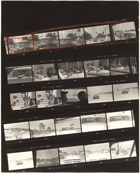 Robert Frank made this contact sheet, titled Florida 12, using gelatin silver print around 1958, as part of his work on the book *The Americans*. Frank, a Swiss immigrant, traveled across the United States, funded by a Guggenheim Fellowship. His photographs challenged the idealized image of America, documenting social issues like racial segregation, poverty, and the growing consumer culture, revealing a stark contrast to the American dream. The contact sheet is a sequence of images showing beach goers and their cars. We see families, couples, and groups of people enjoying leisure time. The abundance of cars is an interesting commentary on America's growing consumerism in the post-war era. To understand Frank's art, it’s important to look at the social and political context of the 1950s. Archival materials, personal letters, and historical accounts can provide insights into the artist's motivations, and this work’s critical perspective on American society.