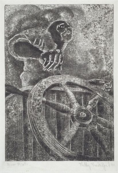 Bernard Reder crafted this linocut, titled "Horse," using stark black ink on paper. The composition immediately strikes you with its tension between the abstract and the representational. The horse, depicted in bold strokes, is almost secondary to the geometric forms that surround it. A large spiral dominates the lower portion, its radiating lines contrasting with the rough, textured block behind the animal. Reder's use of negative space is crucial here. The white areas aren't merely blank; they define the shapes and contours of the horse and its environment. This interplay of positive and negative, black and white, invites us to question traditional notions of figure and ground. The linocut's crude cuts and the lack of shading add to the image's raw energy. This print isn't just a picture of a horse; it's a study in contrasts, a play with form, and a challenge to our perceptions.
