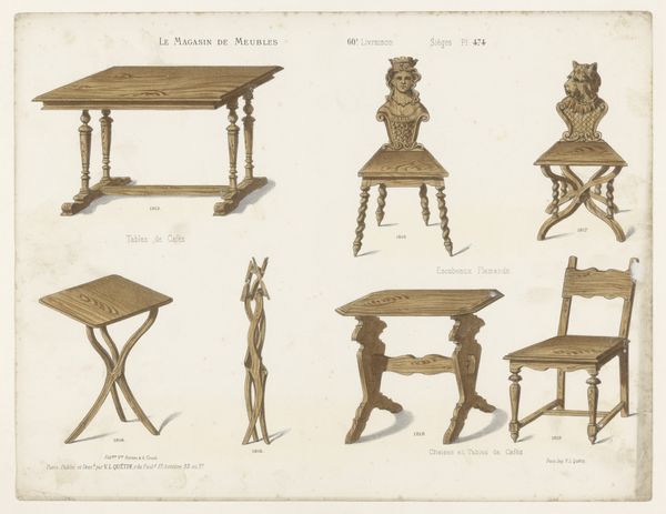 Léon Laroche created this print of four salon tables with an unknown medium, featuring delicate lines and muted colors, evoking a sense of refined elegance and classical charm. The composition of the image is structured around presenting the different table designs in a clear, comparative manner. Each table is rendered with attention to detail, showcasing their unique forms, from the round, two-tiered table, to the more angular designs. The symmetry in each table, balanced by the organic flow of the ornate carvings, suggests an exploration of harmony between form and function. Laroche plays with surface and depth, using the flat plane of the paper to emphasize the three-dimensional qualities of the furniture. The subtle shadows and light create a sense of volume, while the intricate detailing invites close inspection. The muted palette, with its emphasis on whites and creams, reinforces the sense of classical restraint and aesthetic refinement.