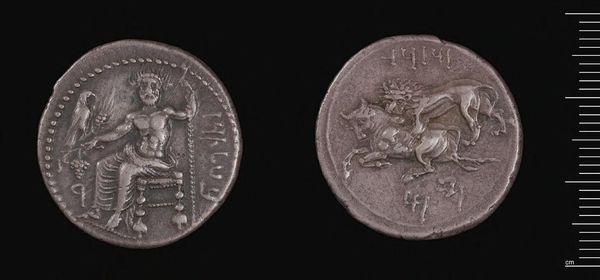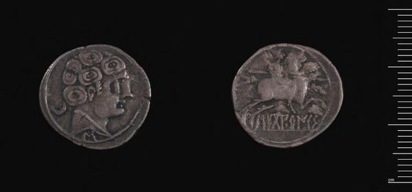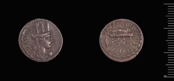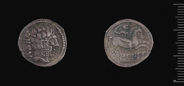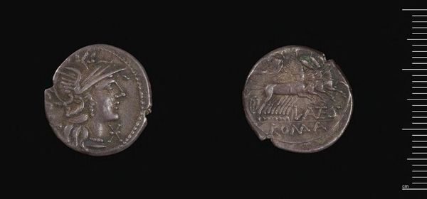 Curator: Let’s explore this Denarius of L. Rustius, a Roman coin, held here at the Harvard Art Museums. It is small, only 3.95 grams, but its surfaces are rich with symbolic imagery. Editor: I am immediately struck by its starkness. The profiles are so sharply rendered, and the metal, though worn, still gleams faintly. It’s like holding a tiny piece of history. Curator: Absolutely. The choice of silver as the material is significant. Silver was directly linked to wealth and power in Roman society. This coin was a medium of exchange but also a potent symbol. Editor: I am fascinated by how such an object would have circulated—the hands it passed through, the transactions it facilitated, and the stories of those people. Curator: The figure of Roma on one side speaks to the power of the empire. While the ram on the other might relate to family lineage or agricultural prosperity. It's a powerful narrative, compressed onto a tiny surface. Editor: It makes you reflect on how something so small could embody such complex layers of social and political meaning. Curator: Indeed, studying its materials and images is key to understanding its role in Roman society. Editor: Thinking about this coin, I see reflections of our present relationship to material and power structures.