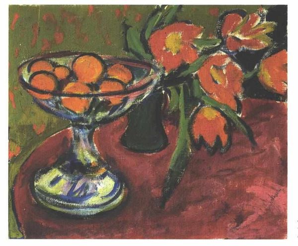 Editor: We’re looking at "Vase d'anemones, citrons et panier sur la table," a still life likely by André Dunoyer de Segonzac. It depicts, as the title suggests, a vase of anemones, lemons, and a basket on a table. The dominant red color creates a very intense and vibrant atmosphere. How do you interpret this work? Curator: The intensity is exactly what draws me in. Red can be a powerful, even confrontational color, symbolic of revolution, passion, and, in some contexts, even violence. But it is worth asking ourselves, how does the artist employ it here, especially within the Post-Impressionist style? Editor: So, beyond just the color, where does Post-Impressionism fit in? Curator: Think of artists reacting against Impressionism's focus on fleeting moments of light. Post-Impressionism allows artists to explore their subjective experience through simplified colors and defined forms, but what about subjectivities rooted in gender and social position? The still life historically became accessible to female artists as the domestic space was seen as acceptable in contrast to more public outdoor settings like those explored by the male Impressionists. The domestic was a battleground over gender roles, economic disparity, and visibility. Does the artist challenge or reinforce these issues, especially considering still life as a gendered tradition? Editor: That is a good point about historical narratives – maybe still lifes weren’t ‘just’ pretty paintings of flowers. Considering this intersection, it certainly invites us to consider the broader social framework impacting how we perceive the image, beyond just visual appreciation. Curator: Precisely. Every brushstroke carries a history, and questioning whose history it is, remains crucial to challenging conventional thinking about the world.
