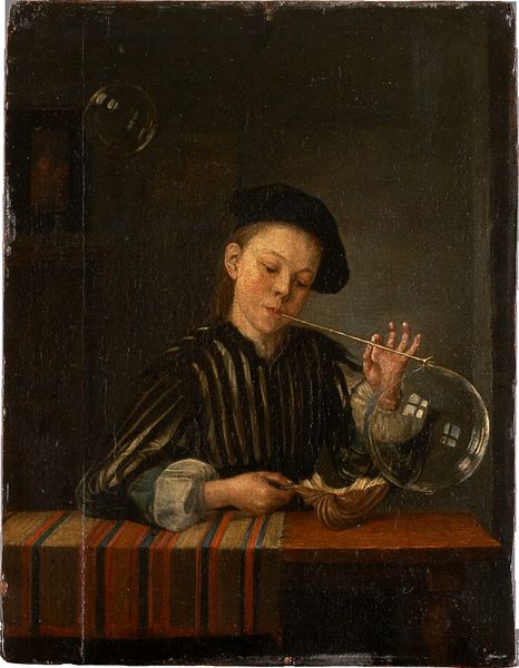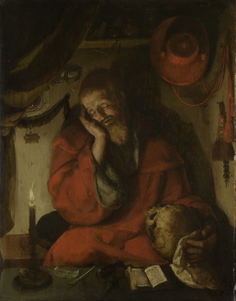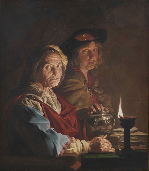 Curator: Here we have Matthias Stom’s oil on canvas, "Old Woman Praying," created sometime between 1637 and 1643. It’s a Baroque painting currently housed at the Metropolitan Museum of Art. Editor: My first impression is somber. The dramatic lighting, the aged face, and those prayer beads hanging heavy—it speaks to a life weathered by hardship, illuminated by faith. Curator: Indeed, the chiaroscuro—the stark contrast between light and dark—immediately draws the eye. The light source seems almost divine, casting deep shadows that emphasize the woman's wrinkled skin, signs of age but also wisdom. The prayer beads themselves, that circular form, are symbols of continuity, a visual rosary leading back to historical faith. Editor: But who is she, really? Genre paintings like this often depicted anonymous figures, representatives of a social class, their individual identities erased in favor of the universal. I can't help but think of the women of that era, their agency and social visibility suppressed. Is this work complicit in that suppression, or does it offer a moment of quiet dignity? Curator: I believe it does offer dignity, even within those constraints. Stom captures a deep interiority, a profound sense of peace found in faith. Consider, the light illuminates not material wealth but the human face in devotion, revealing that inner world, the spiritual resilience held in the darkest of times. Editor: I appreciate your interpretation. However, I also read it as a potent reminder of limited choices women of her time possessed, finding their primary value as keepers of faith, bound within social structures that offered so little individual freedom. This might not only tell a story about personal belief but about the restricted paths offered to the marginalized. Curator: It's that dance between universal archetype and individual experience that keeps the symbolism so potent, isn’t it? The candle flickers, reflecting something deeply historical as it is fundamentally human, and something deeply spiritual, perhaps an individual act that reifies something very old. Editor: A somber moment of introspection, or, perhaps, a silent rebellion. Stom gives us the tools to look and wonder. What's visible is a life of struggle. What’s invisible, and maybe just as real, are the ways in which women carved a space for themselves within rigid social conditions.