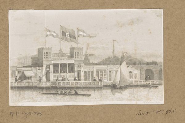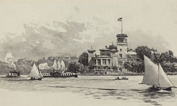 Editor: This drawing is titled "Alsterlust," made in 1893 by Fritz Stoltenberg. It seems to be ink, pencil, and maybe charcoal on paper. I’m immediately struck by the composition - how the floating building dominates the center, contrasting with the hazy city skyline. What do you see in this piece? Curator: What intrigues me foremost is the meticulously rendered facade of the bathing structure itself. Note the architectonic details – the repetition of forms in the rooftop pavilions, the fenestration along the lower level, and the subtle interplay of light and shadow. These elements establish a formal rhythm. What effect does that have? Editor: It creates a sense of order and maybe even grandeur, considering it's a drawing of a bathing house! But I also wonder if that formality distances the viewer. Curator: Precisely! One could argue the linear precision, evidenced by the consistent hatching to describe form, signifies an exercise in rational design over romantic whimsy. Notice also how Stoltenberg employs a restricted tonal palette, further refining our visual attention on the structure. What theoretical considerations come to mind? Editor: Thinking about formalism, I can see how the emphasis is purely on the visual elements. The subject matter almost becomes secondary to the execution and composition. The technique of building form through line rather than color is a fundamental decision. Curator: Exactly. The choice to forego vibrant color, in favor of monochromatic gradations reinforces the aesthetic intention. It redirects the emphasis to the architectonic design. This visual choice echoes structuralist notions that art conveys its subject. What is shown depends on form and visual elements and less on outside, interpretive notions. Editor: I now see how deeply the focus is on the internal visual components – the lines, shapes, and their relationships – creating a world that’s visually complete within itself. Thanks! Curator: Indeed. Considering the systematic relationships present between the elements grants an additional way for viewers to have a unique art-viewing experience.