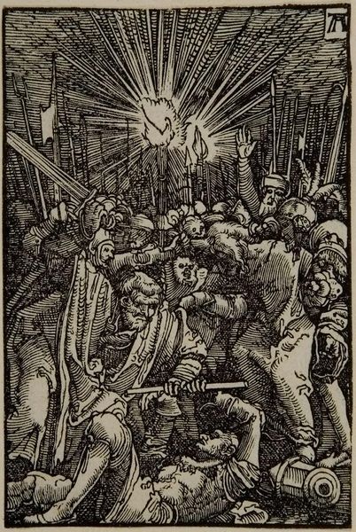 Curator: Looking at Albrecht Altdorfer's 1513 engraving, "The Betrayal, from The Fall and Redemption of Man," now held at The Art Institute of Chicago, I'm immediately struck by its starkness. The black and white contrast, the dense crowd—it feels claustrophobic and volatile. What are your initial impressions? Editor: Yes, that's an apt description! There's a powerful visual tension, isn't there? I’m particularly drawn to the radiant light source at the top, battling against all this chaos, a kind of symbolic beacon almost swallowed by the event itself. What meaning can you draw from the light, given its symbolism within Christian Iconography? Curator: Considering the biblical narrative of Christ’s betrayal, the light likely symbolizes divine presence and knowledge, perhaps even divine judgment. The chaotic throng represents the betrayal and moral darkness descending upon humanity. But notice how Altdorfer uses the graphic medium to amplify these meanings, the tight network of lines creates the effect of unease and adds tension. Editor: Right, and this moment—the betrayal—it's often depicted in grand paintings. But here, as a relatively small engraving on paper, it takes on a more immediate and perhaps even unsettling tone, what statement might that be saying about popular conceptions of art and image? Curator: I think that smaller scale personalizes the scene, and that this level of reproduction helped democratize and decentralize power. This print makes the drama far more accessible, it no longer just hangs in a palace or a church for a selected few to witness, the medium itself plays into the theme of dissemination, a moral lesson gone “viral.” Editor: I agree completely, this would allow for new audiences of many to reconsider their personal accountability and response. It definitely adds another dimension to the betrayal—the public's role in, perhaps, perpetuating such events, generation after generation. What I see is that the message of the betrayal isn’t trapped in this moment, but is re-born anew. Curator: Exactly. And through careful deployment of symbolic imagery and the immediacy of the print medium, Altdorfer ensures its relevance remains. Editor: Yes, a testament to the lasting impact that historical reflection—when powerfully rendered—can offer its audience. Thank you for helping illuminate this fascinating artwork.