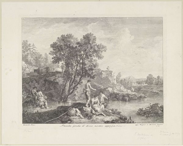 Editor: Here we have Etienne Baudet’s 1684 engraving, "Gezicht met een weg, gebouwen en mensen," which translates to "View with a road, buildings and people". It has this wonderful, serene atmosphere, contrasting grand architecture with scenes of everyday life. What draws your eye to this work? Curator: It is all about the etching and engraving processes for me! Look at how line is deployed – to what end is it deployed, in the specific conditions of late 17th-century French society? Here, this linear language serves a powerful purpose. The means of production speak volumes about artistic intention. Editor: So, you're seeing the process itself as communicating something? Curator: Absolutely! Engraving and etching are labor-intensive processes, accessible to only the privileged artists, who relied upon wealthy patrons and powerful technologies of visual reproducibility. The deliberate and uniform nature of the line suggests both precision, control, and luxury. What class is this piece geared toward, given its making? Editor: That makes a lot of sense. Given the expense involved, this kind of image probably circulated among the wealthier elites... almost as a souvenir of a sort of aristocratic experience of the countryside? Curator: Precisely. The print isn't just about aesthetics; it's about class and accessibility. This contrasts high art with popular art by highlighting labor. Look at those crisp lines, think about the resources needed, then the intended market. Suddenly, this cityscape whispers about 17th-century social stratification! Editor: It really reframes the way I look at landscape prints like this one. Seeing it in terms of production, of who had access and why… I never thought about it that way before. Thank you! Curator: My pleasure. Reflecting on how materials and making can embed this image with meaning? That is key to art history.