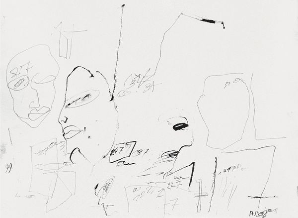 Curator: Alfred Freddy Krupa created "The bird is awakened" in 2008. It's an ink drawing in monochrome that blends abstraction and gestural marks. What strikes you first? Editor: The raw energy, I think. It's visceral, a tangle of lines fighting for space on the paper. It’s restless and somewhat anxious. Curator: It’s fascinating how Krupa, who positions himself as a contemporary ink painter, takes an approach rooted in historical practices and really pushes them to the edge of something new. Consider the lineage of ink wash painting, the calligraphic tradition, and now, this explosion of abstract form. Editor: And within the context of abstract expressionism, that push toward gestural abstraction can read like a rebellion against established artistic norms. But I’m curious about this "awakening." What societal shifts might Krupa be commenting on here? Is it environmental, political, personal? Curator: The title invites a socio-political read, certainly. Post-conflict societies are often sites of tremendous energy and cultural production; I would explore the specifics of the locations with which he has ties when thinking about these forces. But on a formal level, I can imagine how he uses visual tension—between these bursts of black ink and blank space—to mimic the energy of transformation. Editor: Right. And that restraint, limiting the color palette, actually amplifies the impact, especially when viewed through the lens of sustainability within art practices. There is nothing extraneous. Curator: It almost has a Rorschach quality, too, this bird emerging out of chaos. A rebirth. What narratives could this provoke in viewers confronting their own relationships with social awareness? Editor: Yes. It makes me think of cycles, and the ongoing, necessary disruption for growth, both personally and collectively. The struggle embodied here feels very real, as does the promise of renewal. Curator: Well, on that hopeful note, it's been interesting to consider Krupa's work and its reflections on awakening within these historical and contemporary moments. Editor: Indeed, an inspiring piece to reflect upon where we stand and where we might head.