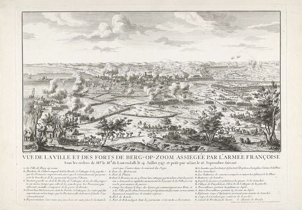 Curator: Here we have Jean Baptiste Guélard’s engraving, "View of the Battle of Lauffeldt Won by King Louis XV against the Allied Army on 11 July 1747," created between 1747 and 1748. It offers an intriguing, almost clinical perspective on the battlefield. Editor: Clinical is a good word. My immediate impression is a sense of unsettling detachment. The meticulous details create a strange sense of order out of the chaos of war. It almost resembles a map more than a scene of conflict. Curator: Exactly. This piece fits within a tradition of history paintings commissioned to solidify royal power. Guélard's engraving visualizes Louis XV’s victory, shaping its memory for public consumption and reinforcing his image as a triumphant leader. Editor: But look closer. Despite the declared victory, the image presents a very flattened view. It lacks dynamism. Doesn’t that contribute to a strange glorification of power by rendering people as small units? I'm curious about what was intentionally omitted. Where are the wounded, the terror? The price of war, usually paid by everyday folks? Curator: That absence is telling. This wasn't intended as a raw, emotional account but a calculated projection of strength. The style—the clean lines and orderly arrangement—is very much in keeping with the Baroque aesthetic prevalent at the time. Note how this bird's eye perspective detaches the viewer, almost enabling them to strategize. It’s very much about control. Editor: It makes you think about who this piece served and its role in perpetuating the status quo. What was its social function? Even in its omissions, the work says so much about the elite narrative it promotes and at what cost. Curator: Indeed, thinking critically about the historical contexts allows us to unravel the complex interplay between art, power, and social control. Editor: Looking closely allows us to remember that the political use of imagery continues today and requires a watchful, critical eye.