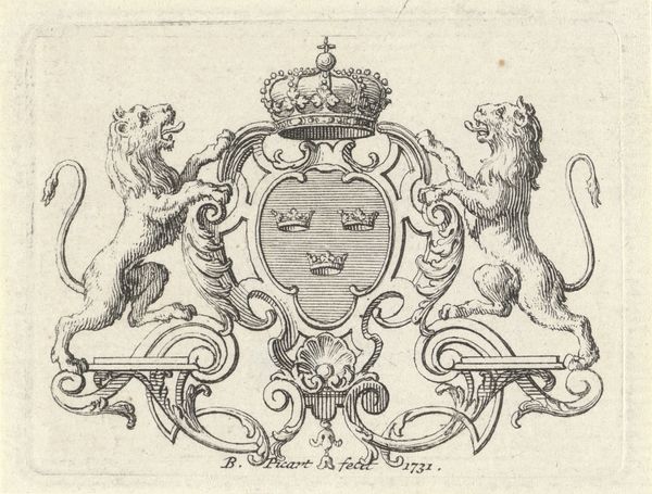 Bernard Picart created this crowned coat of arms with tree and three flowers as an etching sometime between 1696 and 1733. It exemplifies the intricate symbolism prevalent in heraldry during the early 18th century. The design features a central shield with a tree and flowers, symbols often associated with nature, growth, and prosperity. What strikes me are the figures flanking the shield. These masculine figures challenge traditional representations, embodying a divergence from the rigid gender norms. Picart, who was of French origin, spent time in the Netherlands during periods of religious persecution in France. It is important to consider how his personal history may have influenced his artistic choices. The figures introduce a powerful narrative layer, inviting viewers to think about their own experiences and emotional connections to the artwork. This emblem serves as a reminder of the ever-evolving narratives that visual art creates.