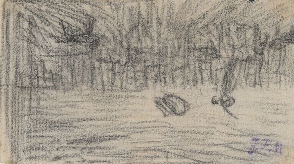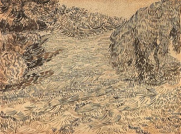 Curator: This drawing, executed in ink on paper, is Vincent van Gogh’s "Bush in the Park at Arles," created in 1888. It’s currently held in a private collection. Editor: There's an almost agitated energy in this sketch. Even with the restricted monochrome palette, the density of the lines is overwhelming and a little oppressive. The contrast between light and shadow feels stark. Curator: Absolutely, and that emotionality is conveyed so powerfully through his use of line. Look at the marks. Each stroke is individual, deliberate, vibrating with life, in an outdoor, plein-air style. Editor: And what a specific choice of place! Arles, in the south of France, was pivotal for Van Gogh. He aimed to create an artist's colony there, a utopia—a moment laden with both promise and the inevitability of disillusionment. Does the park itself become a stage for this drama? Curator: It's intriguing that you say "stage," as gardens have always had symbolic weight as curated versions of Eden, spaces to enact social performances. Do you see it representing an enclosed paradise perhaps? Editor: Potentially, or even more of a controlled and curated society? Though look closely, because the untamed strokes destabilize that reading somewhat. It’s as if the very ink rebels against the imposed order. Even the marks of the 'grass' are forceful, vertical strokes, almost like a barricade! Curator: It might point to the psychological impact of his time in Arles. He arrived with Gauguin, his idol, then came conflict, mental deterioration… Editor: Leading to the ear incident, internment… Suddenly, that feeling of agitation reads as a premonition of the turmoil to come, almost an early sign of madness. This drawing is charged with anxiety that his most famous works conceal behind bright colors and masterful brushstrokes. Curator: Indeed, and remembering this drawing allows us to think about other interpretations of his Arles period that acknowledge the looming storm clouds of isolation. Editor: Ultimately, 'Bush in the Park at Arles' delivers such a concentration of the artist’s impending breakdown into the image of a landscape—it transforms a simple park scene into an anxious interior.