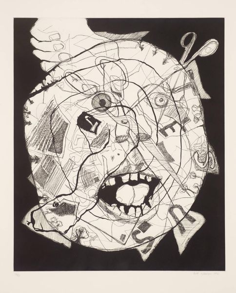 Editor: This is "Portrait Head and Neck" by Tony Bevan. I’m immediately struck by the stark black and white contrast and how raw the image feels. What can you tell me about Bevan’s process and the meaning behind such a visceral image? Curator: Well, let's consider the materiality. The woodcut technique itself, with its bold lines and stark contrasts, speaks to a deliberate engagement with the physical process of art-making. How does the texture of the wood itself contribute to the impact, do you think? Editor: I guess I hadn’t really thought about the labor. I see how the grain adds another layer. Almost like the figure is emerging from the material itself. Curator: Exactly! It's a potent reminder that art is not just about representation, but about the tangible realities of production and the artist's physical engagement.