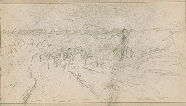 Editor: Right, let's talk about this sketch. It's called "Composition Study of Cavalrymen Next to Their Horses," by George Hendrik Breitner, dating from 1896. It’s a pencil drawing currently held at the Rijksmuseum. It feels so fleeting, like a memory glimpsed through a fog. So sketchy! What stands out to you? Curator: You know, that's exactly what grabs me – the transience of it all. It's like Breitner captured a snippet of bustling city life – a military encampment, perhaps? – before it vanished. Imagine the smells of horse and leather, the rumble of hooves, the brief quiet moments before the cavalrymen ride off to some unknown fate... You feel that nervous energy too, right? The Impressionists really did have something magical, if fleeting! Do you find any clues to its realism within its sketchy style? Editor: I guess that comes through the postures of the horses and the men. They look so natural, not posed at all, which is something I usually look for in Realism! But why focus on a scene like this? Curator: Well, Breitner was fascinated by the everyday life of Amsterdam – its workers, its streets, its fleeting moments. Horses were a particular obsession. He wasn’t idealizing anything, just showing what he saw. The beauty in the ordinary, so to speak. Makes you think about what *we* choose to document, doesn't it? What daily scenes we find beautiful. Editor: Definitely gives you a different appreciation for snapshots. Thank you! Curator: Anytime, the magic lies within!