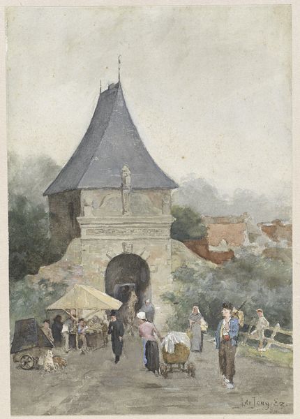 Editor: So, this is Rudolf von Alt's "The Spittler in Nuremberg," created in 1856 using watercolor. It has this kind of subdued, romantic feel, but I'm also drawn to the intricate detail. How do you read it? Curator: It's interesting to consider this watercolor as a record of production. Alt is depicting Nuremberg at a moment of transition. Notice how meticulously he renders the medieval architecture—the stones, the textures of the walls. But in the background, you see those smokestacks, right? Editor: Yeah, I spotted them. The industry seems distant, but it's definitely there. Curator: Exactly! Alt is employing watercolor—a portable and reproducible medium – to document a specific place undergoing industrialization. He is depicting both the remnants of the old and the looming presence of the new. How do you think his choice of medium informs the viewer's perception of the city's evolution? Editor: I hadn't thought about it like that! It is like the fragility of watercolor captures the ephemeral nature of what he's documenting: a world on the cusp of radical change, maybe even the transformation of labor itself? Curator: Precisely! And the choice of viewpoint too - he has selected this vantage point very deliberately to capture that tension. Consider the availability of such art through the market; even its status as something "collectable." Editor: This makes me see how his landscape painting shows a complex negotiation between traditional forms and emerging realities. Curator: Exactly. We can use this lens to interrogate similar works. Thinking about materials and means, how can we understand art as both a product of and a commentary on its social and economic environment? Editor: That's a powerful shift in perspective; looking at the painting not just as an image but also as a piece of material evidence opens up many possibilities for understanding its meaning and its historical value.