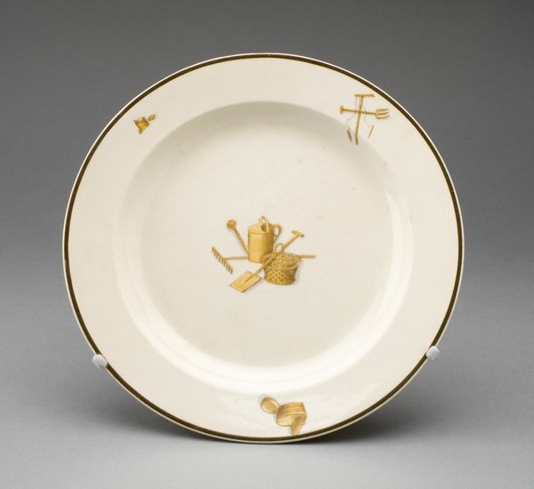 Curator: The pristine white porcelain and the delicate ornamentation of this saucer offer a glimpse into the material culture of early 19th-century Holland. Made before 1814 by the Koninklijke Porseleinfabriek Dommer & Co., it is part of a tea service and features meticulously rendered trophies suspended from a ribbon. Editor: My initial impression is one of gentle leisure—a celebration of leisurely pursuits elevated to an aristocratic register through the Rococo style's ornamentation and porcelain as a medium. Curator: Absolutely, the visual elements coalesce to suggest an aristocratic sensibility. The composition relies on a centrally positioned motif with symmetrical weighting, and then further visual tension is built through the contrast between the hard lines of hunting implements and the soft, flowing lines of the ribbon and foliage. Note, too, the delicate stippling and watercolor-like quality in the trophies themselves, a sign of skilled painting. Editor: Speaking of skill, the materiality speaks volumes. The fine porcelain would have been produced through extensive labor involving sourcing materials, molding, firing, painting—each stage requiring expertise. It highlights the intense networks required to produce this luxury item for the tea table. Curator: Indeed, we could analyze these "trophies" themselves as signifiers of elite activity. The trophies symbolize status and wealth translated into visual rhetoric. Further, consider how this object—originally purely utilitarian—became, through decoration, elevated to the aesthetic. Editor: Right. The question is, who exactly was drinking from these cups, and who made it? This factory provided wares that upheld elite tastes, reinforcing a social order dependent on exploitative labor and colonial trade for things like tea. We can see through this object how labor and material resources upheld power structures. Curator: Ultimately, the saucer is a well-considered aesthetic statement. The piece uses symmetry and the balance of hard/soft visual elements to elevate leisure into an abstract artform, and is, at its core, a visual performance meant to represent wealth and power through symbolic refinement. Editor: So we end with a decorative object illustrating a material and social hierarchy expressed through skill, labor, trade, and those pastel trophies that denote belonging and class. A delicate vessel carrying quite a bit of weight.