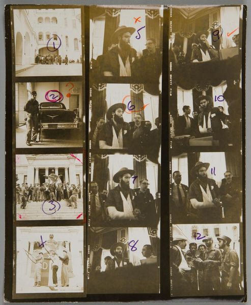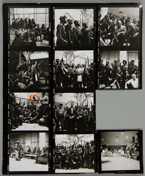 Editor: Here we have Lester Cole’s "Untitled (eleven photographs: group portraits of Cuban revolutionaries)." These black and white photographs feel immediate, almost like raw documentation. What strikes you about this piece? Curator: These photographs, presented as a contact sheet, speak to the means of production. The very format emphasizes the process of capturing these revolutionaries. Note the photographer's marks, the notations directly onto the film. Editor: So, it’s less about the finished image and more about… Curator: Exactly. Consider the labor involved, the social context of revolution being captured, and how the photographic process itself becomes part of the narrative, pushing against any romanticized view. It's about the material realities of image-making and its role in shaping historical narratives. Editor: That's a really interesting way to look at it. I’ll have to keep that in mind.