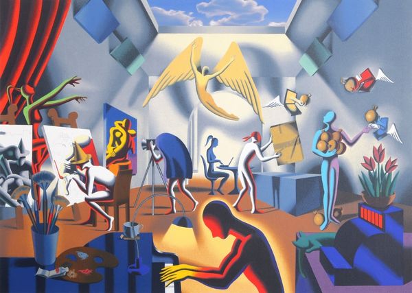 Curator: Good morning. Today we are exploring "Entfaltung," an oil painting created in 2008 by Neo Rauch. Editor: My first impression is of organised chaos; the figures are meticulously rendered, but the scene overall feels unsettling, almost dreamlike. Curator: Rauch emerged as a significant figure in the "New Leipzig School," which brought figurative painting back into prominence in Germany, especially after the reunification. "Entfaltung" which can be translated to "Unfolding," encapsulates a certain political unfolding as well as his personal history as someone living in East Germany after the fall of the wall. The painting's subject matter appears pulled from several places that represent Rauch’s experiences living in the former East Germany Editor: Yes, you can definitely see the tension through his bold palette choices: those reds against the muted blues. The composition too feels fractured; nothing quite resolves, creating visual dissonance. Note, for example, how figures seemingly emerge from nowhere with hands holding papers. What do you think the hand held documents represent? Curator: They evoke a sense of bureaucracy, which in communist East Germany permeated all aspects of life. These scattered, detached hands holding documents might symbolize the impersonal, administrative machinery of the state intruding on individual existence. His father was a college student who died in a train accident, while his mother was sent to work as a bookkeeper as part of the "Back to the Countryside" movement. These bureaucratic structures were prevalent during his formative years. Editor: It's as if the personal is relentlessly shadowed by the official, leaking onto the canvas and affecting the viewers perceptions. Notice how the light in the work seems deliberately unbalanced; figures bathed in direct lighting contrasting sharply with shadowy recesses. This evokes feelings of disquietude and apprehension. Curator: I concur, and let's not ignore Rauch's unique positioning in art history. Emerging post-reunification, his work became a site for processing the psychological residue of a society undergoing intense transformation. "Entfaltung" might capture some of the turbulence of that period as his experiences are communicated through bold, raw images. Editor: I can now appreciate the painting a bit better given its historic and personal context. Its beauty arises in its ability to weave political narrative, personal grief, and abstract composition all into one work of art. Curator: It is definitely one of his masterpieces; his visual vocabulary prompts us to consider the profound effect of the social and political contexts on personal and shared memory.