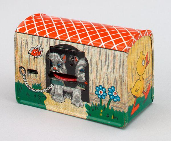 This anonymous little bank, *Saving Elves (registering)- still bank*, uses printed lithography on metal to create its images. The colours are mostly flat and contained, but there’s a kind of handmade feel in the way the elves are drawn, a charming naivety. Look closely, and you’ll see the surface isn't perfectly smooth; there are bumps and irregularities. The colours are bright in some areas, faded in others. It’s got that lovely, worn texture that tells a story of use and time. I love how the design incorporates the function; the way the elves are depositing coins right above the slot. The whole object feels like a playful comment on value and labor. It reminds me a bit of some of Red Grooms's sculptural streetscapes, but with a touch of folk-art simplicity. It's a reminder that art doesn't always need to be highbrow; sometimes it's just about making something fun and functional, an everyday object that sparks a little joy.