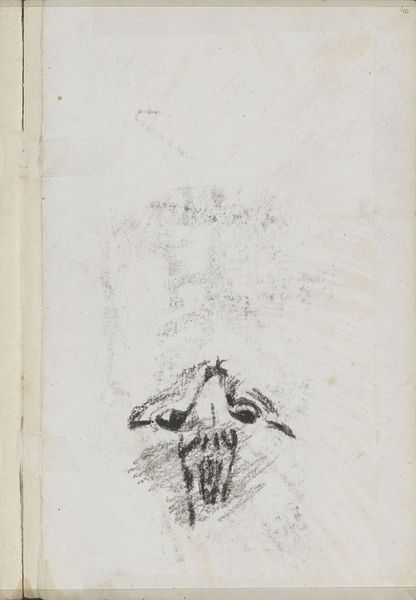 Curator: This is George Hendrik Breitner's "Kop van een kat", dating back to the 1880s, residing here at the Rijksmuseum. It’s a pencil drawing, showcasing Breitner’s quick observational skills. Editor: Aw, it's like a little secret glimpse into a cat's dream. Sort of melancholic, almost as if it's lost in thought about tuna. The lines are so light; you can feel the artist's hand hovering gently over the page. Curator: Indeed. Note the swift, economical strokes that delineate the cat’s form. Breitner’s command of line is evident even in this informal study, reflecting a certain efficiency typical of realist artists dedicated to capturing fleeting moments. Editor: Fleeting, definitely! Makes me think of shadows, whisker twitches, sunlight catching in the corner of an eye… You know, those tiny moments that evaporate if you blink. The incomplete quality actually enhances it—like catching only part of the magic. Curator: One might analyze the composition here—the negative space, the strategic placement of the form off-center. These contribute to a sense of dynamic tension, preventing the image from becoming static despite its fragmentary nature. The "F" scribble in the upper-left, possibly a notation, becomes integrated within the work's textual fabric, complicating interpretation. Editor: Ooh, I hadn’t noticed that "F". It's like the cat’s initial, a clue to a tiny kitty crime novel waiting to be written. Perhaps a stolen saucer of milk? It humanizes the creature. Curator: Considering Breitner's wider oeuvre and realist concerns, the artist’s formal investigation into the depiction of form here supersedes narrative flights of fancy. While sentiment is permitted, we mustn't occlude critical discourse that unveils technique. Editor: Right, right...Technique is important, obviously. Still, this tiny study does more than just document shape—it's like Breitner gifted us a portal to feline contemplation. The soft greys on this suggest a softness—or at least something I’d love to cuddle with. Curator: Undoubtedly, Breitner's exploration here suggests larger points of enquiry related to late 19th-century aesthetic developments. Editor: It definitely inspires one to pause. Thank you.