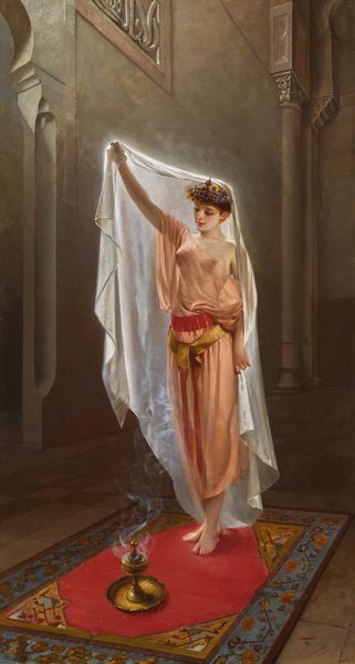 Adrian Gottlieb’s painting, Medea, is realized with oil paint on canvas. The artist relies on a traditional understanding of the medium, mixing dry pigments with drying oil in order to achieve a variety of effects. There's a particular skill that Gottlieb uses to achieve an almost photographic rendering; the light is distributed unevenly throughout the composition, with some areas being heavily illuminated and others darkened to create shadows and highlights. This effect is achieved through a complex layering of brushstrokes; a labor-intensive approach. The painting's visual depth, combined with the unsettling subject matter, gives it a strange, captivating quality. The artist has also made use of a range of techniques – blending and layering – to capture the rich color of the protagonist's robe, the reflective surface of the blade, and the golden sheen of the character’s diadem. These materials, processes, and context provide us with an understanding of the painting’s full meaning, while also challenging traditional distinctions between fine art and craft.