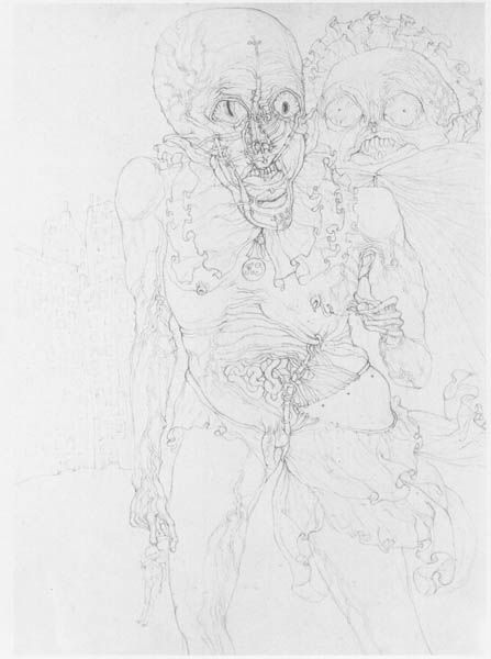 Curator: Our next artwork is an Untitled drawing by Zdzislaw Beksinski, executed in graphite and pencil. Editor: The initial impression is unnerving, even macabre. It’s incredibly detailed but also chaotic. A tightly packed composition of monstrous, seemingly tormented figures. Curator: Beksinski is known for these surreal and often disturbing visions. There are strong currents of Expressionism, channeling intense emotion through grotesque figuration. Consider the crowned figure at the top left – a grotesque parody of power. What historical archetypes could that be a warped reflection of? Editor: The mark-making, this feverish cross-hatching, generates tremendous textural variety. Notice how the light seems to emerge from within the forms, heightening the sense of unease, amplifying the expressive effect. Curator: Yes, the light guides us, highlighting these grotesque faces. The figures seem almost fused together, their identities blurring. The artist explores powerful themes of mortality, decay, and possibly the disintegration of the self. It feels steeped in a certain allegorical tradition. Do these figures trigger collective anxieties? Editor: Absolutely. The lack of clear definition, of easily identifiable forms, forces the viewer into a space of interpretation, of imposing their own order—or lack thereof. Even on repeated viewings, the overall structure keeps evading complete comprehension, always alluding to a different way of decoding. Curator: Perhaps this is the power of abstraction – the suggestion of narrative without clear answers. The work exists to question, to provoke a sense of our internal darkness. Beksinski consistently used unsettling symbols in his art to explore the more frightening parts of the human condition. Editor: I still see a master class in pure technique here. It’s not just subject matter; it’s the expert handling of the materials. Graphite and pencil become vehicles for expressing profound angst and unsettling dreamscapes. Curator: An unsettling glimpse, indeed, into the anxieties that dwell within the collective human experience. Editor: A technical triumph that elevates the disturbing imagery, prompting deeper analysis beyond just thematic unease.