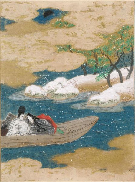 Editor: Here we have Tosa Mitsunobu's illustration to Chapter 47 of the Tale of Genji, called Trefoil Knots. It's quite small, rendered on paper, and depicts figures in a boat. I'm struck by how dreamlike the golden clouds seem. What do you see in this piece, and how does it relate to its context? Curator: This illustration provides a visual entry point into understanding gender roles and power dynamics within Heian-era court society. The Tale of Genji itself, often attributed to Murasaki Shikibu, a woman writer, offers a lens into the lives of women navigating a patriarchal court. Editor: So, even the act of illustrating this story is a form of commentary? Curator: Precisely. Consider how women, often excluded from formal education, found ways to express themselves and critique societal norms through literature and art. This image, by depicting a scene from the Tale, also participates in that act of cultural interpretation and negotiation. It's a visual echo of a literary voice that itself challenged the status quo. Editor: That's a fascinating perspective. I had only considered the visual aspects, but now I see the social layers within the work itself.