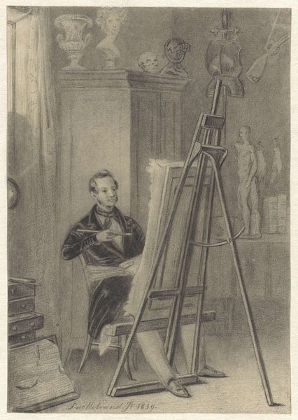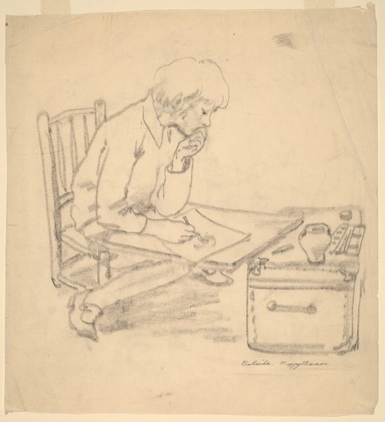 Stefan Hirsch made this lithograph, Untitled (Robert Laurent in Studio), using a traditional printmaking process. The image emerges from the smooth, gray surface of the lithographic stone, achieved by the artist’s hand alone. The texture, weight, color, and form of the lithographic crayon, when applied to the stone, directly influence the appearance of the artwork. The artist would have needed skill in drawing, and knowledge of chemistry to prepare the stone and fix the image, before printing it onto paper. The scene shows the studio of Robert Laurent, also an artist. We see his tools, such as the easel and drawing board. He appears to be working on a sculpture. The print thus elevates the artist's workplace as a site of labor and creativity. It emphasizes the amount of work involved in the production process. Paying attention to the materials and processes used by artists such as Hirsch allows us to understand the full meaning of their work, moving beyond traditional distinctions between fine art and craft.