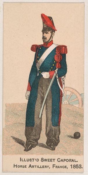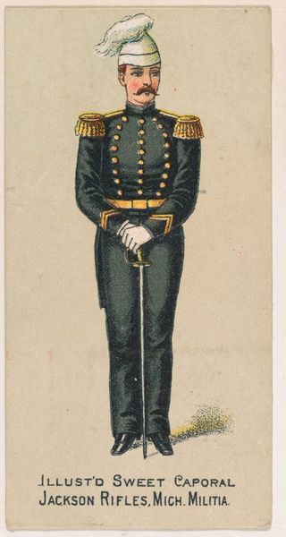 This small chromolithograph of a Spanish Naval Officer, dating to 1853, comes from a series of collectible cards distributed by the Kinney Tobacco Company to promote Sweet Caporal Cigarettes. These cards offer a glimpse into the cultural values of the late 19th century, specifically a romanticized vision of military power and national identity. The figure is idealized, embodying notions of masculinity, authority, and European dominance, yet it obscures the complex realities of Spanish colonialism and military history. The card's circulation coincides with a period of intense social and political change, including rising nationalism, industrialization, and debates over imperialism, which offers us a window into the entwined relationship between commerce, ideology, and representation. Though small in scale, the card served as a vehicle for shaping public perceptions of history and identity.