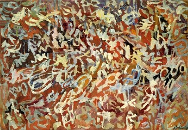 Editor: Here we have “Bird’s-eye view” by Pierre Alechinsky, rendered with acrylic paint. It's such a flurry of colours! Mostly warm oranges, whites, reds, all merging and diverging. It feels so… turbulent, almost feverish. What strikes you most about it? Curator: Feverish is spot on, I think! For me, it feels like looking through a kaleidoscope, fragmented and vibrant. There’s a looseness here, an improvisational quality reminiscent of automatic writing, you know? Like letting the hand wander across the canvas, unrestrained. Do you pick up on any hints of recognisable shapes or forms struggling to emerge? Editor: Now that you mention it, yes, there are glimpses. Are those almost-faces? It’s like my brain is trying to find patterns where maybe none were intended. Curator: Exactly! It’s the push-and-pull between abstraction and figuration that makes it so compelling, right? He offers just enough to let our imaginations run wild, creating a landscape, or perhaps an emotional state rather than a physical place. It asks you to enter the painter’s mindset as he approached the canvas. Does it invite you in, do you feel? Editor: It definitely does. At first it felt overwhelming, but now, seeing those emergent forms, I feel like I want to reach into it and understand the world on Alechinsky’s plane. Curator: Isn't it incredible how a seemingly chaotic canvas can reveal such intricate layers and a profound connection with its viewers? It certainly leaves a lingering aftertaste of creative chaos, which is definitely his genius. Editor: It definitely changed my initial impression. It made me look and look again!