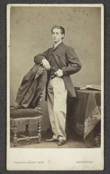 Editor: This gelatin-silver print, titled "Photographs from the Estate of Isabel Wachenheimer," was taken by Pau Audouard in 1906. The subject's gaze and formal attire project an air of self-assuredness. How do we contextualize this portrait beyond its aesthetic appeal? Curator: Considering Audouard’s body of work, often portraying the bourgeoisie in Barcelona, this image becomes more than just a portrait. It is a statement about class and representation in early 20th-century Spain. Who was Isabel Wachenheimer, and what did her estate represent in that society? The image invites us to investigate the power dynamics inherent in portraiture itself. How does this staged depiction contribute to the construction—or perhaps the reinforcement—of societal hierarchies? Editor: I hadn’t considered it that way. I was primarily focused on the visual aspects of romanticism and academic art present, but thinking about the subject within her historical context certainly does change things. Curator: Exactly. Romanticism often idealized subjects, sometimes masking the realities of their social positions. By acknowledging these intersecting layers of representation, we can interpret the image not only as a singular depiction of an individual but also as a reflection of larger social and political systems at play. In what ways do you think that this picture might have challenged conventional stereotypes about gender or sexuality for that historical moment? Editor: Perhaps by displaying a male sitter in what may have been interpreted as a 'feminine' romantic style? I am now starting to see just how much this photograph opens up lines of inquiry! Curator: Precisely! It challenges us to deconstruct preconceived notions and engage with the portrait critically, prompting dialogue and a more profound awareness of intersectional histories and cultural values. Editor: Thank you! This photograph definitely gave me a broader perspective and made me reconsider portraiture, beyond pure aesthetics.