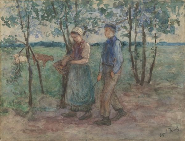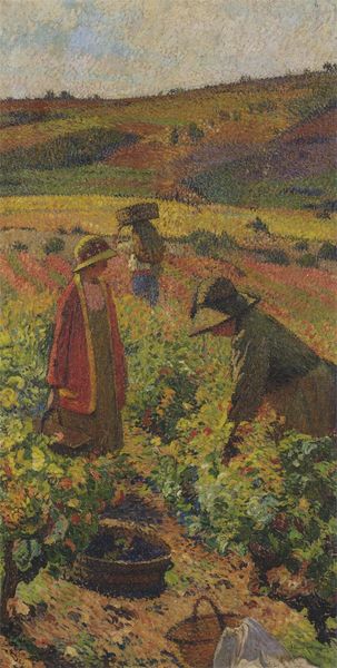 Camille Pissarro created this painting, "Two Young Peasant Women," using oil paint and a pointillist technique. This method, characterized by applying small, distinct dots of color, departs from traditional painting techniques and reflects an interest in the science of optics. The materiality of the paint itself, carefully dabbed onto the canvas, creates a textured surface that is integral to the overall effect. The dots of color blend in the viewer's eye, creating a vibrant and luminous image. The subject matter, peasant women, also bears significance, it reflects Pissarro's interest in portraying rural life and the laboring class. In a time of industrialization and social change, Pissarro highlights the value of manual labor, and perhaps comments on the slow pace of change in the countryside. Looking closely, we can see the skill and labor involved in both agricultural work and the making of the painting itself. These materials and methods allow us to fully appreciate the artistic and social context of Pissarro's work.