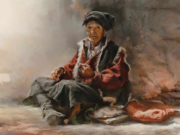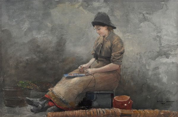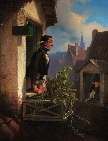 Curator: This is Antonio Paoletti's, “The Little Orange Seller”, an oil painting that invites us into a sunny Venetian scene. My first impression? There's a melancholy undercurrent to what seems, at first glance, idyllic. Editor: Melancholy, interesting. I'm drawn to how this painting encapsulates aspects of labor and the youthful resilience amidst likely harsh socio-economic conditions of children in Venice, it's a moment frozen within an economic system. Curator: Precisely. Notice how the young seller, perched on the stone, surrounded by his wares—more lie on the ground. We are likely looking at an Italian Renaissance influence here, that may not always sit right today. How the position of the boy might lead the observer to have an understanding on his position in this urban setting. Editor: And this positioning tells us more when contextualizing what was socially expectable. His surroundings almost seem to emphasize a socio-economic stratification that highlights what was acceptable behavior for an upper and lower societal standing. Curator: I completely agree, there is so much here. Let’s reflect on the fact the pigeons add an element of every-day city life, yet somehow underscore this boy's isolation, that creates such a strong statement and really emphasizes what might have happened in this very space for decades. Editor: It creates such an interesting point. I wonder if that melancholy sense comes in fact from our own projection on a boy selling oranges on the street that may or may not have been as bleak as we see it in the early twenty-first century? Curator: Exactly, it brings up our modern-day awareness and really causes the space for necessary questions of societal expectations and limitations. "The Little Orange Seller" provides more than just a scenic glimpse. Editor: Definitely. It's a testament to how paintings can be these critical time-capsules of the intersection between power and perception, while showcasing the need for continuous cultural discussions on labor.