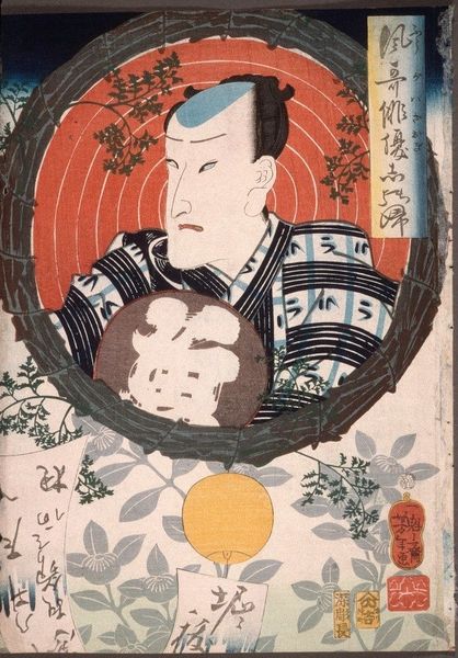 Curator: Just look at that incredible texture, the way those grey tones wash across the paper. There’s a sort of ethereal, ghostly quality that is initially quite arresting. Editor: That's quite fitting actually, as this is “Actor as Nikki Danjo,” a woodblock print by Utagawa Kunisada, dating from 1857. The character depicted, Nikki Danjo, is a villain known for his treachery and demonic associations, central to the famous kabuki play Yoshitsune Senbon Zakura. Curator: Villainy certainly oozes from the composition. The swirling mists, those almost luminous grays surrounding him—they completely detach him from reality, pushing him into the realm of archetype. And what about that beast lurking behind? Its elongated, reptilian form suggests all sorts of primordial evils. Editor: That serpent form echoes throughout Japanese mythology; it’s a powerful visual device for encoding dark intentions. In this particular print, the theatrical role of Nikki Danjo is intertwined with these darker, older beliefs. The rolled scroll he holds to his lips… consider what power it represents. Secrets, curses, perhaps even instructions from the netherworld. Curator: It's interesting how Kunisada uses those geometric patterns on the actor’s kimono, this intricate system of layering and lines that almost act like a shield, but they can’t conceal the malevolence in his expression. The meticulous detail in his costume is offset by the soft, dreamlike atmosphere around him. I see the traditional garb functioning almost as a mask; he hides in plain sight. Editor: That's precisely how the symbolism works. Consider the context in which this print would have been produced and consumed; Kabuki theater was an important cultural institution but it was also considered somewhat subversive. Kunisada, through these stylistic choices, encodes moral lessons that run deeper than the theatrical presentation. Curator: I'm struck by how, despite the overt references to the demonic and treacherous, there’s something undeniably beautiful in the artistic execution itself. The way Kunisada manages to reconcile these opposing forces makes for a strangely captivating image. It's a testament to the lasting power of symbolism. Editor: It certainly showcases how the most profound art often operates on multiple levels simultaneously—a celebration of form intertwined with layers of complex meaning.