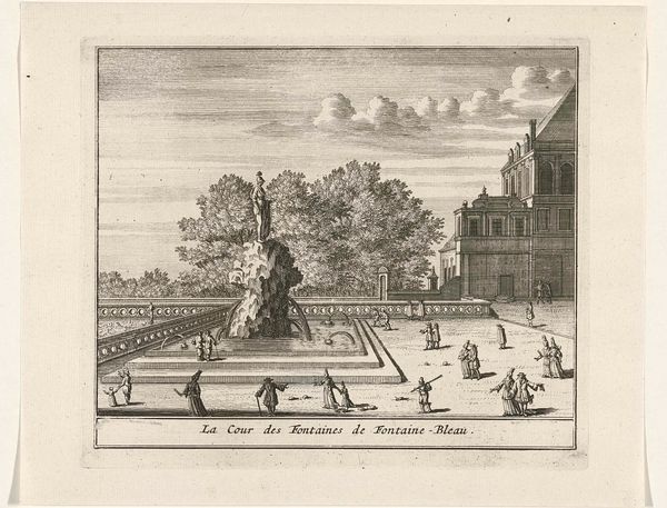 Curator: Let's discuss this engraving of Fontainebleau, made by Jan Lamsvelt between 1726 and 1743. It depicts "La Grande Chapelle et la Salle de Bal" or the Grand Chapel and Ballroom of the palace. It gives such an exacting view of the architecture, and its formal gardens! Editor: My first impression is the almost stark contrast between the severe architecture and these tiny, seemingly carefree figures populating the space. It feels like a stage set, the actors dwarfed by the backdrop. What purpose did prints like this serve back then? Curator: Exactly! These prints had multiple functions. Of course, as accurate depictions of important places, they had documentary value. However, they also played a key role in shaping and disseminating ideas about French power and architectural grandeur. Think of it as early architectural photography for the elite. The very act of representing a space implies an ideal vision of the monarchy. Editor: I'm thinking of who the artist served in crafting this "ideal vision." It’s propaganda, isn't it, cloaked in landscape? Lamsvelt would have had patrons, commissioning influences, not to mention the socio-political climate which would have all shaped his creative decisions and representation. Curator: Indeed. And in its style, the image is representative of Baroque landscape. Look at the structured formality—the way the landscape architecture reinforces the building's symmetry. Notice the linear perspective and the precision used to capture minute details on the Grande Chapelle. Lamsvelt shows off his technical ability. Editor: I can't help but also see the vast differences between the wealthy patrons who experienced this firsthand, compared with the people for whom the print served as a reminder of their station. It’s about emphasizing social stratification by carefully managing public space. Curator: Precisely. And disseminating that message widely! It shows how power is visually constructed and consumed, not just through direct experience but through representation as well. Editor: It gives one pause to consider who is remembered in this era. While the figures in the engraving stroll carefree through the space, people are still in their thrall, consciously and unconsciously influenced by the past’s shaping of modern day. Curator: An important thought. It illustrates that every artistic portrayal, even seeming objective ones, carries inherent ideologies worth scrutinizing.