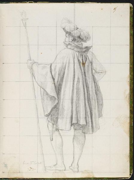Curator: Jacques-Louis David, a prominent figure of the Neoclassical movement, created this graphite sketch called "Standing Nude, and a Cardinal; verso: Faint Sketch of Jean de Cambacérès, Duc de Parme, Arch-Chancellor of the Empire." Editor: I’m immediately struck by the figure’s anonymity, hidden beneath those flowing robes and wide-brimmed hat. There's a vulnerability in the soft lines and the way the figure is positioned on the page. Curator: It's fascinating to consider this within the context of David's political affiliations. Note the cardinal’s presence alongside what appears to be a nude study, with a sketch of a high-ranking official on the back – it speaks to the complex power dynamics at play during the era. Editor: Absolutely. The contrast between the religious and the secular, the exposed and the concealed, raises questions about societal expectations and the artist's own position within them. What does it mean to sketch a cardinal alongside a nude study? Curator: It gives us a view into David's process, revealing a glimpse into the society he navigated. Editor: Indeed. It's a potent reminder of art’s entanglement with politics and power.