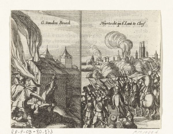 Editor: This print, "Plundertocht van de Spanjaarden in het land van Kleef en moord op Wirich von Daun, graaf van Falkenstein, 1598," is attributed to an anonymous artist and dates from 1619 to 1621. The medium is engraving. I'm immediately struck by the sharp contrast between the detailed figures and the chaotic scenes of war. What visual elements stand out to you in this composition? Curator: Formally, I find the division into two distinct panels quite compelling. The left panel utilizes linear perspective to depict a large-scale military advance, with foot soldiers and cavalry moving towards a cityscape engulfed in smoke. Note the orthogonals created by the receding lines of soldiers, which draw the eye deep into the scene. Conversely, the right panel presents a more intimate, violent encounter. Editor: The contrast in scale between the two panels is very noticeable. While the left feels expansive and panoramic, the right is claustrophobic and brutal. Curator: Precisely. The engraver employs dense hatching and cross-hatching to create tonal variations, adding depth and texture. Observe how the flames are rendered with sharp, erratic lines, conveying a sense of intense heat and destruction. The figure of the slain count in the foreground becomes a focal point. Semiotically, the flames signify the disruptive forces of war, but also potentially a spiritual transcendence or purification. Editor: It’s fascinating how the artist uses line and composition to communicate such a strong narrative despite the limited color palette. Curator: Indeed. It demonstrates how the fundamental elements of art – line, form, and composition – can effectively convey complex narratives and evoke visceral responses. This piece prompts us to carefully consider the formal strategies employed in early printmaking, which carry meaning and structure the narrative. Editor: I'm definitely viewing prints in a new light now! Paying attention to the linework and contrasting panel designs really changes the way I understand it. Curator: My pleasure. Looking closely reveals how composition is paramount to creating effective narrative, whatever the artistic discipline.