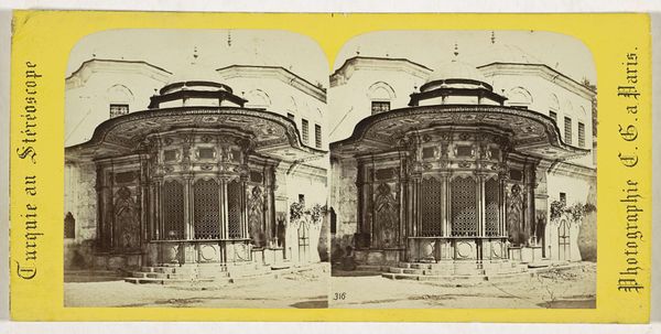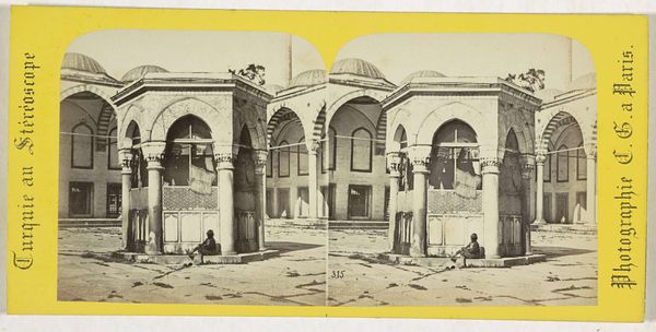 Editor: This is a stereoscopic photograph by Charles Gaudin, taken sometime between 1861 and 1870. It’s titled "Pavilion of the Kiliç Ali Pasha Complex in Tophane, Istanbul.” It feels very still, almost staged, despite supposedly capturing a real moment in time. How should we understand its perspective? Curator: Well, we need to consider the context of Orientalism. Photography at this time often served to reinforce Western perceptions of the East. Images like these, intended for a European audience, frequently aestheticized and romanticized Islamic architecture and life, simplifying complex realities. Notice how the light highlights the architecture while any human presence is secondary, adding to a narrative crafted for outsiders. How do you think this affects our interpretation of the ‘real’ Istanbul? Editor: So, it’s not just a photograph of a building; it's a construction of a particular idea of Istanbul? Were these photographs popular? Curator: Massively so! The popularity of stereoscopic images brought the 'exotic' into Victorian homes. It’s a carefully managed portrayal intended to promote the observer’s cultural authority, effectively telling viewers "this is how you should perceive the East." It served a colonial agenda by presenting a seemingly objective record that reinforced pre-existing beliefs. Do you think the fact that it’s presented as stereo photograph reinforces its authenticity? Editor: I see, like a three-dimensional ‘proof.’ Thinking about it now, this stillness almost feels like a performance for the camera. I'll definitely keep the Orientalist lens in mind moving forward. Curator: Absolutely, recognizing the socio-political motives of visual media like photography can help us to challenge simplified stories, enriching our understanding of both the artwork and the culture it represents.