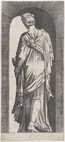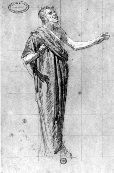 Curator: Domenico Beccafumi's study, "Saint Peter," at the Harvard Art Museums, depicts the saint holding keys and a book. He seems like a gatekeeper, doesn’t he? Editor: He does. The keys, of course, symbolize Peter's role as keeper of the keys to the kingdom of heaven. But I see a man burdened by that responsibility, etched by the weight of history and the church. Curator: The artist uses a chiaroscuro woodcut technique to emphasize that emotional depth. Note how the light catches the folds of his robes, drawing your eye to the keys as emblems of power. Editor: I'm also struck by the contrast between his bare feet and the heavy, draped clothing. It speaks to the tension between earthly vulnerability and divine authority that the church often struggles with. Curator: Indeed, a tension central to the figure of Peter himself. He's both a humble fisherman and the rock upon which the church is built. Editor: Absolutely. This image serves as a powerful reminder that even figures of great authority are rooted in human experience and subject to the same struggles as everyone else. Curator: It offers us a chance to consider the visual weight of those symbols through time. Editor: Ultimately, art like this asks us to reflect on the power structures, visible and invisible, that shape our world.