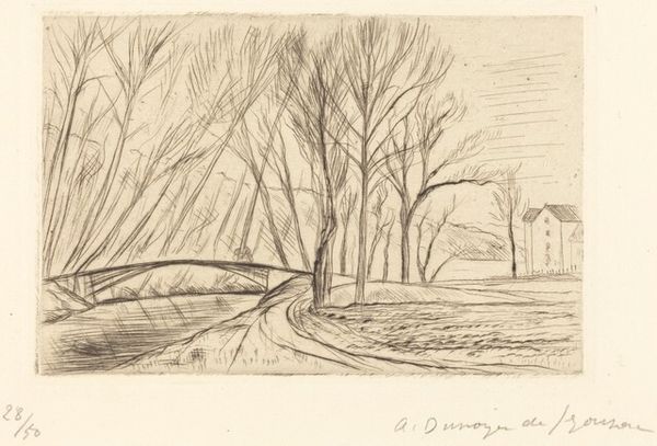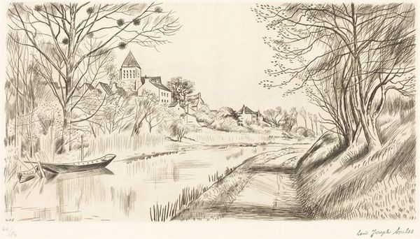 Curator: What do you think? Editor: My first impression? A delicate quietude. There's a real sense of stillness held within those tangled lines. It feels like a secret moment. Curator: I feel that. The piece is called "The Sluice at Serbonne", an etching created in 1923 by André Dunoyer de Segonzac. It’s interesting how Segonzac has captured the French countryside with such a spare technique. Editor: Sluices… gateways for water, for controlling flow. Looking at it now, the image holds that liminality too—like a threshold. Water is a very loaded image, representing, the ebb and flow of the unconscious. The reflections…they are a sign of what? Is the future in front of us or behind? Curator: Well, water’s symbolism goes deep, no pun intended. Perhaps Segonzac was considering the intersection between man and nature, the controlling of nature's energy? Editor: Or the inherent, maybe futile attempt to regulate nature’s untamable power? Notice how the architecture is geometric and clearly defined but then everything in the natural environment is drawn in tangled thin lines that break up shapes rather than clearly defining them. Is he playing with the distinction between the artifice and the fluidity of nature? It also brings to mind traditional Chinese landscape painting where water also holds symbolic value, carrying spiritual significance. Curator: The layering and the scratchy, energetic mark-making—the medium allows such beautiful possibilities. The ink really conveys the feeling of a chilly day near the water, perhaps capturing something beyond just a picturesque scene. It seems the image and the method speak a related language. Editor: Etching is, in itself, a kind of revealing, stripping back an image… revealing something perhaps buried beneath the surface. Segonzac presents us with more than just a landscape. It feels like an exploration of the self and our place in the natural order of things. An interesting tension between order and chaos. Curator: Very beautifully said, I feel enlightened to what I was blind to earlier. Editor: Well, hopefully that brings some deeper dimension for visitors as they stand before it.