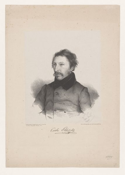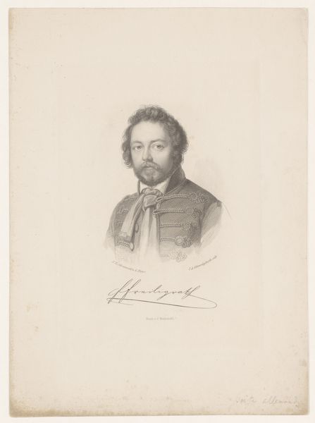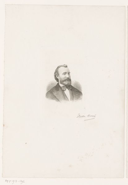 Editor: Here we have Alphonse Farcy's "Portret van Félix Pyat," an engraving from 1849. It has a somewhat severe tone. I mean, I'd hate to be on the wrong side of this guy, just based on his portrait. What do you see in this piece? Curator: This image, beyond being a simple portrait, speaks volumes about the political climate of 19th-century France and the role of individuals within social upheaval. Félix Pyat was a socialist journalist and playwright deeply involved in the revolutions of 1848. The somewhat stern expression you observed can be seen as a reflection of the political struggles he faced. Do you see how the artist uses realism not just to capture likeness, but perhaps to convey Pyat's convictions? Editor: That makes sense. I guess I was just seeing the face, not the story behind it. So, the artist is trying to make a statement about his politics, but is he in support of them? Curator: Exactly. Farcy's work places Pyat within a larger conversation about revolution and social reform, suggesting he sees Pyat's face, or at least the idea of his politics, as having power. The engraving itself, as a medium, also played a critical role in disseminating political ideas and imagery during that era. Can you imagine the impact an image like this might have had on the working class at the time? Editor: So it's like visual propaganda? Curator: It participates in the popular dissemination of political imagery. I find myself reflecting on how portraiture can actively shape public perception and contribute to the narratives surrounding political figures, even now. Editor: I see this work in a totally different way now! Thanks for providing all this context.