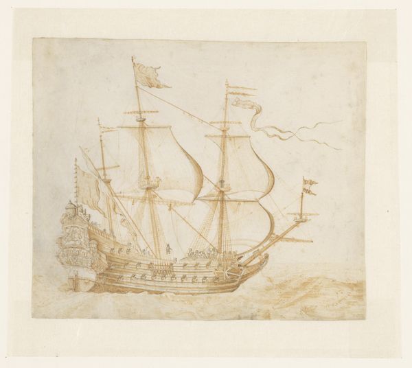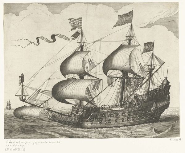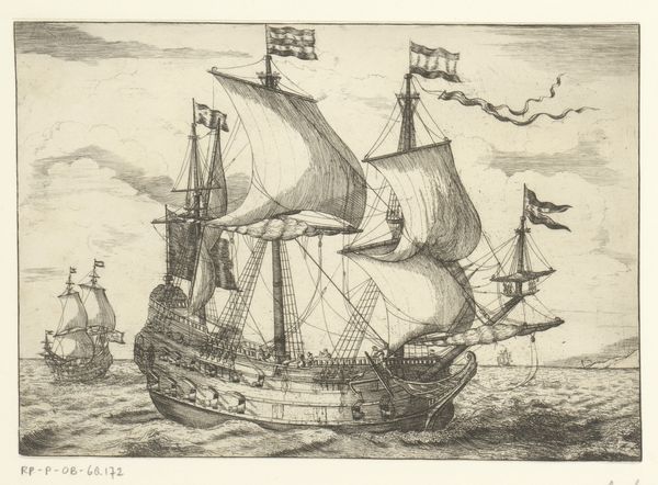 Curator: Here we have a Dutch Golden Age print, “Oorlogsschepen op een woelige zee,” or “Warships on a Turbulent Sea,” created between 1673 and 1709 by the artist Monogrammist ABK, housed here at the Rijksmuseum. Editor: My immediate impression is one of drama. The waves look quite agitated, almost angry, and the warships appear to be caught in a rather precarious dance with the sea. Curator: Indeed, the turbulent sea is not merely a backdrop, but almost an active participant. This work comes at a time when the Dutch Republic was deeply involved in maritime power struggles. Depictions of ships weren't just about naval prowess; they signified national identity and mercantile strength. The engraving itself, being a readily reproducible medium, allowed for widespread dissemination of this message. Editor: Absolutely. And the choice of imagery is deliberate. The ships aren't just any ships; they are warships. War, historically, is laden with symbols. The flags, the sheer scale of these vessels, the cannon ports...it speaks of dominance, control, and perhaps even a warning to potential rivals. Curator: Precisely! The artist plays with light and shadow to accentuate the dramatic effect, and line engraving allowed for precise detail, showcasing the grandeur and technological advancement of these seafaring machines. This wasn’t only an artistic exercise, but a political one as well, reminding the viewer, and perhaps other nations, of the Republic’s strength. Editor: And there’s something about the slightly raised stern of the main vessel—almost tauntingly positioned higher than the choppy waves, and heavily decorated—that communicates both triumph and perhaps even a little hubris. I wonder how audiences then perceived the subtle undercurrents of meaning present in these vessels at sea? Curator: An excellent question. Perhaps now, observing this print in the context of the Rijksmuseum, we can better appreciate not only the technical skill involved, but also its vital role in shaping and projecting a particular image of Dutch power during a complex and often volatile period. Editor: I agree, thinking about it as both an aesthetic and a symbolic document really deepens its impact, revealing multiple layers beneath the surface.