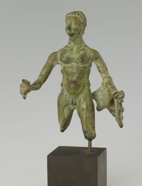 Editor: So this is *Een man*, or "A Man," a wooden sculpture by Gerrit Schouten, made before 1839. He’s got this wonderfully dynamic pose, almost mid-leap. The texture of the wood and the dark coloring give him a weighty, grounded feel, despite the movement. What's your take on it? Curator: Well, immediately, I'm struck by the power of this figure's posture, wouldn't you agree? He's captured mid-action, but what action? Does this uplifted hand signal a plea, a warning, a celebration? That seemingly simple gesture reverberates through centuries of art, carrying layered meanings. The rope around his waist and small cloth are interesting. What symbolic meaning do you suppose the rope and the marking on the loin cloth bear? Editor: It's interesting you say that, how a simple gesture carries so much meaning...I hadn’t considered it. Maybe it speaks to his position, the rope maybe representing restraint or obligation? Curator: Precisely! And that simple cloth covering carries symbolic weight as well, hinting at both vulnerability and a distinct cultural identity, particularly when seen through the lens of colonial history. Don't you find it compelling how a few visual cues unlock broader narratives? Editor: Absolutely, that makes the sculpture far more thought-provoking than I initially considered. I was focusing more on the dynamism and less on the, I guess, historical and cultural symbolism? Curator: Indeed. He's frozen in time. Yet the symbolism helps us consider his origin, but also the historical trauma embedded in representations of African people by European artists of that era. A loaded object to view in our present, isn't it? Editor: It really is. Seeing this sculpture now, understanding some of its cultural context, it adds a depth that wasn’t immediately apparent. Curator: Right, and how the past lives within the present. A figure holding immense, and enduring, power.