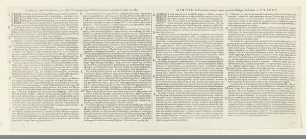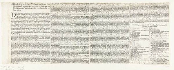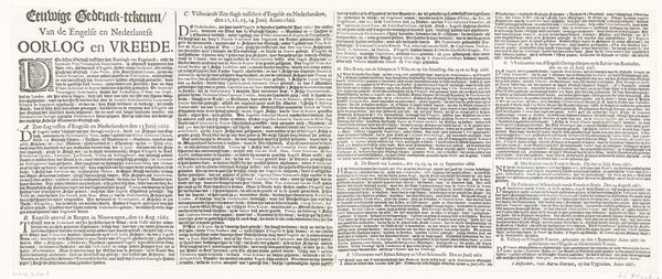 Curator: Looking at this print, it's almost overwhelmingly dense. All text! A striking, austere composition given it celebrates peace. Editor: Indeed! This is "Vrede van Breda, 1667," an engraving by Marcus Willemsz. Doornick. And you are right: it's an unusual artistic choice for commemorating a peace treaty, a complete absence of celebratory visual iconography. That choice certainly makes it read quite differently through modern lenses. Curator: Absolutely. Given that its title translates to "Peace of Breda," I am initially drawn to analyze the socio-political climate in which it was conceived. Why choose text over a more obviously celebratory image? Who was this intended audience? Editor: Precisely! This piece reflects the shift toward documentary approaches that became prominent within Dutch Golden Age aesthetics. The print's success hinged on communicating treaty details, almost like a legal document made accessible for public record. Its reception would hinge on people understanding the war's socio-economic ramifications and this official closure. Curator: It seems an exercise in early information dissemination. We’re conditioned to approach war commemorations with narratives of heroic glory or tragic loss, which creates the tension I see when juxtaposing this objective presentation of information alongside such emotionally weighted cultural memory. Did it subvert those tendencies? Editor: It challenges our conventional expectations. As a printed medium intended for relatively broad distribution, consider how these details—written rather than rendered in images—shape public opinion about the terms and perceived fairness embedded within this peace. Curator: Yes! So the choices involved in relaying complex sociopolitical negotiations about power and equity through typography impact understanding and cultural memory of such events even now. The austere nature pushes the content itself forward. What’s included and how that content is styled? Editor: Precisely. This artifact compels reflection upon those power dynamics at play within the context of early information design practices. How successfully it promoted actual equity among varied stakeholders implicated by the Treaty’s parameters, remains open to examination and critical theorization now. Curator: Thank you! That puts the whole piece in a fresher, necessary, light. Editor: A necessary lens, indeed! Thank you for illuminating those relevant points today!